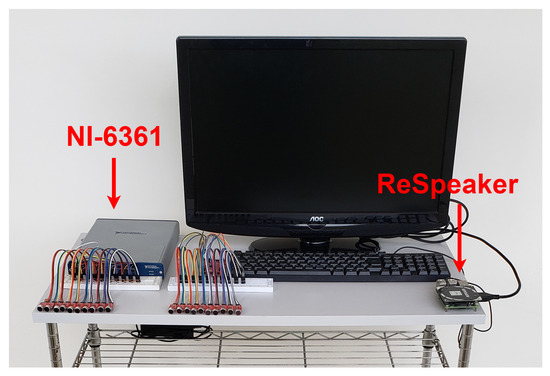 We use two sets of measurement equipment to collect audio data: (i) a low-cost setup with a ReSpeaker Core v1 (MT7688) board [26] using the Analog-to-Digital Converter (ADC) AC108 with four ADC delta-sigma, 48 kHz of sample rate, and V voltage range, with four microphones connected to a Raspberry Pi 3 (model B) processor to collect and store the data; and (ii) a Data Acquisition (DAQ) NI-6361 from the National Instruments (National Instruments, Austin, TX, USA) as redundant equipment to validate the measures of low-cost setup with 16 bit resolution and 1 MS/s of sample rate. In this case, a Sony Vaio laptop (Core i3 processor, model PCG-61A11X, Vaio Corporation, Azumino, Japan) is used to receive the data from the DAQ.