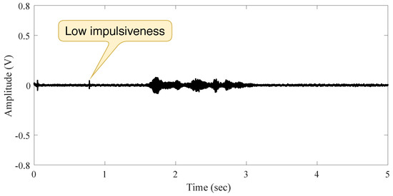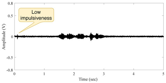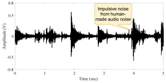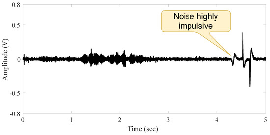 The second measurement in indoor scenario is accomplished when a speech signal source is present, and the person intentionally made small moves before speaking. The measured signal exhibits a hardly ever impulsive noise (because of the person’s moving), as shown in Figure 4. This is evidence of the independence between noise and audio source as well as the low impulsiveness of noise in this scenario (low noise power compare to the signal power).
