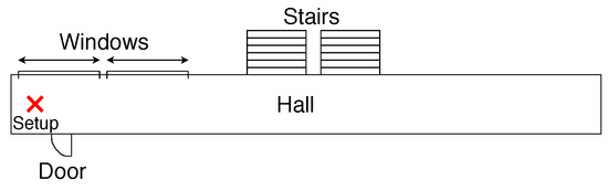 We labeled the second environment as the Hall Scenario. It is a scenario noisier than the indoor, represented in Figure 5. Its mixed indoor/outdoor configuration is composed of two windows and two doors, allowing audio noise from wind. The measures were performed at night in the absence of noise from equipment as a Heating, Ventilation, and Air Conditioning.