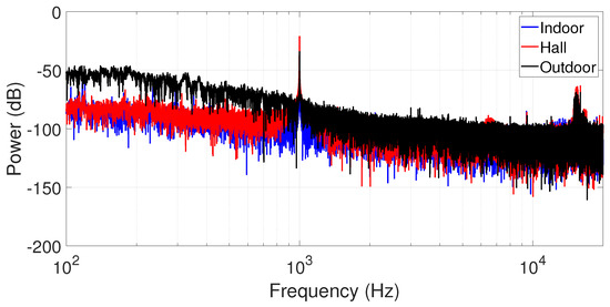 We complete our analyses by characterizing the measured data in the frequency domain using the estimated Power Spectrum Density (PSD). Assuming the impossibility to measure the signal-to-noise ratio (SNR) of a signal subjected to a highly impulsive noise (because of its infinite variance), we estimate the PSD within a time window of 1500 samples for all scenarios. We highlighted a narrowband part of the spectrum from 100 Hz to 20 kHz and an audio source is the tone of 1 kHz at 1.5 m from the measurement point. Due to this proximity, the source is easily sensing, as shown in Figure 11.