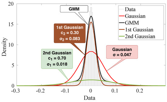 Illustration of Gaussian mixture model fitting with two Gaussians (data from the outdoor scenario in a time window with severe impulsiveness).