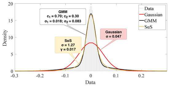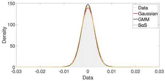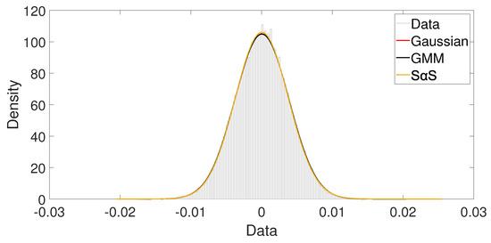 Parameters estimated for Gaussian, Gaussian mixture model, and -stable models.