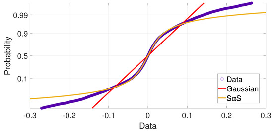 As expected, the simplest Gaussian model has not succeeded to fit well the data with impulsiveness due to its unbounded variance. We conclude that Gaussian is not a suitable model for this data, whereas the GMM has better performance. Finally, the SS model has the best fitting performance, as a result of accurate modeling of the heavy tails. Figure 16 confirms this thought by showing the comparison of the cumulative distribution of data and the Cumulative Distribution Function (CDF) of Gaussian and SS models (with the estimated parameters of the Table 1). The plots are for the outdoor scenario where the low value of suggests high impulsiveness and a non-Gaussian behavior [8].