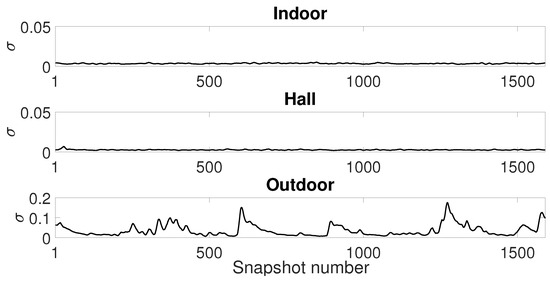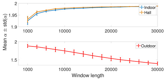 First, we show in Figure 17 the variance of the values (from SS model) estimated for the whole set of 240,000 samples. We split samples in time windows of fixed size and evaluate the variances of the estimated inside window sizes from 1000 to 30,000. Looking at the results for indoor and hall scenarios, we see that longer the window size is, the more stable is the estimation (the lower the variance). However, for the outdoor scenario, this behavior is only observed for more extended window sizes (longer than shown in the Figure 17, suppressed for better visualization of curves). Comparing the results for the three scenarios, we can choose a window length of 1500 samples for the parameter analysis. This window provides a trade-off of low variance (estimation stability) and the window size. From a system point of view, a long window size could reflect higher signaling cost or latency.