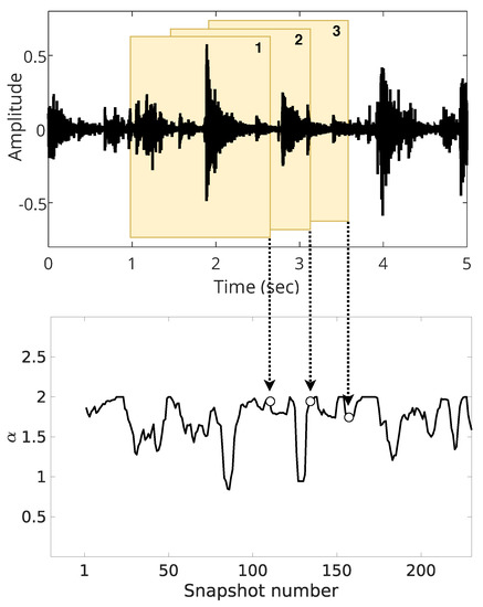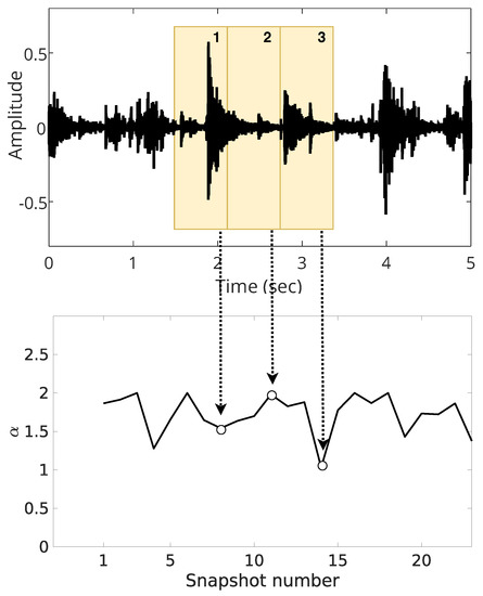 Figure 9 and Figure 10 present the signal in the outdoor environment without audio source and with a person’s speech, respectively. A careful observation of the signal behavior suggests that it does not have a constant second-order moment (its variance is time-dependent). This could happen as a consequence of different origins of noise, such as traffic, unknown speakers, crowds, wind, and human-made. We claim there is more impulsiveness if different noises sources are present.