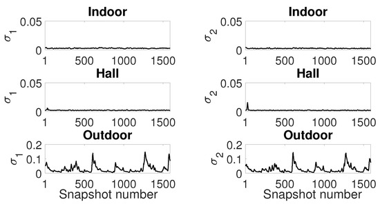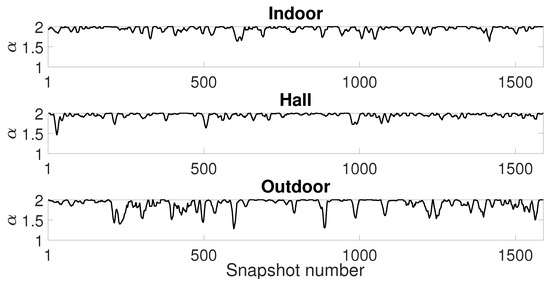 Finally, looking at the parameters for -stable model (Figure 22), one can confirm that the outdoor scenario has a highly impulsive noise due to the values near to 1. We may conclude that values far from 2 indicate a poor fitting of Gaussian model and noise data. It suggests that the variance from Figure 20 is not enough to describe the noise data, especially from the outdoor scenario.