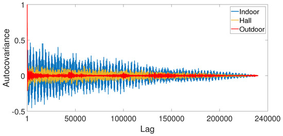 Figure 23 presents the autocovariance of the measured signal for all scenarios (without audio source). Thus, it seems reasonable to consider that the outdoor scenario represents non-stationary behavior due to the uncorrelated signal with itself. On the other hand, the indoor scenario has high values of autocovariance, representing a stationary behavior.