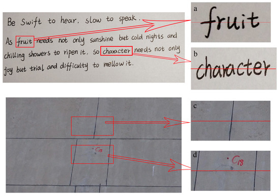 Two typical high-contrast images. And (a–d) are four example parts of the text image and the crack image.