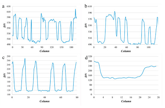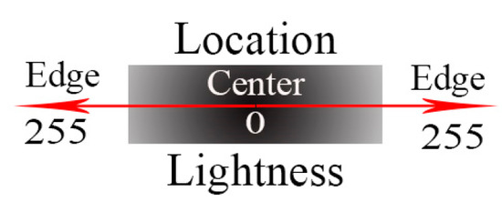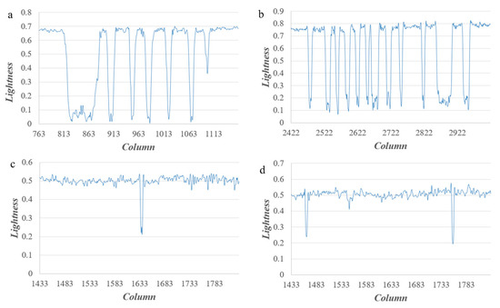 For the high-resolution and high-contrast images where the dark target is surrounded by a bright background, the reflectance of the target pixel contains the contribution of the scattering of background pixels, namely the adjacency effect. Furthermore, the brighter the background pixel is, the more obvious the adjacency effect [51]. The adjacency effect is related to the distance [52] and the further away from a target pixels, the less obvious the adjacency effect is. All in all, the adjacency effect is dependent on the environment [53,54]. There is a correspondence between the dark target’s location and its intensity. Two typical high-contrast images, a text image and a crack image, are selected to display the correspondence as shown in Figure 1. Four parts of them (Figure 1a–d) are selected to show the details, and the intensity (lightness) profiles are obtained along the lines in each part, as shown in Figure 2. Combined with Figure 1 and Figure 2, the intensity value of characters and cracks vary because of the adjacency effect. Further, the lightness profiles show that pixels of characters or cracks at the middle part have a lower intensity value whereas pixels at the edge have a higher intensity value, i.e., there is a correspondence between the dark target’s location and its intensity value due to the adjacency effect.