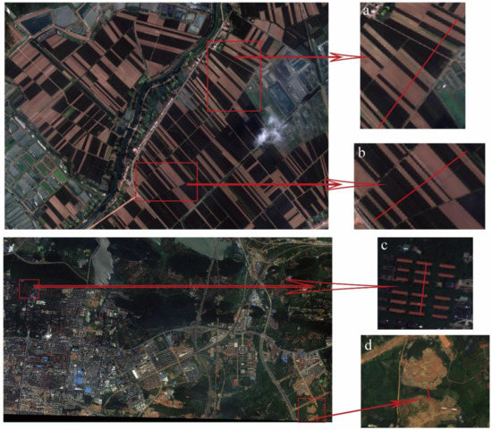 High-contrast scenarios in GF-2 and Worldview-2 images. And (a–d) are four example parts of the GF-2 image and the Worldview-2 image.