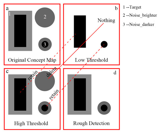 Concept map of Low-High threshold detection strategy. And (a) is the conceptual map consists of noise, dark target and bright background. (b) is the conceptual map of detected result using a low threshold. (c) is the conceptual map of detected result using a high threshold. (d) is the conceptual map of rough detection result using the low-high threshold detection strategy.