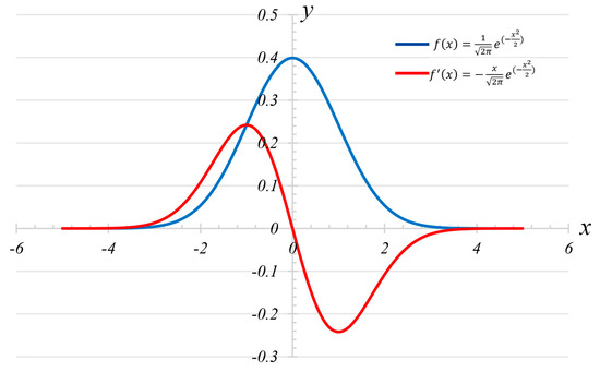 and only affect the position and width of the curve of the function and , and they have no effect on the shape of the curve (bell-shaped symmetrical curve). Therefore, the case where is 0 and is 1 is used to describe the curve shape of Gaussian probability density function and its first derivative formula function , as shown in Figure 8.