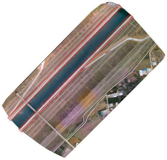 A total of 18 UAV high resolution and high contrast images in a concrete slope protection project are used in this study. They are RGB images of 4000 3000 pixels and the ground sampling distance is about 5 mm. Given Section 2.3.3, the resolution of images should be higher than 2/3 and the UAV images can satisfy the resolution requirement. However, the images are resized to remove water and trees at the side of the slope projection before the experiments. The overall concrete slope protection project is shown in Figure 10 and the test areas are included in the red rectangular frame.