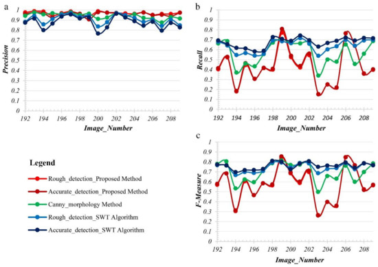Detection accuracy for expansion joints of all images. And (a) is the Precision curves using the proposed method, the canny_morphology method, and the SWT Algorithm. (b) is the Recall curves using the proposed method, the canny_morphology method, and the SWT Algorithm. (c) is the F-measure curves of using the proposed method, the canny_morphology method, and the SWT Algorithm.