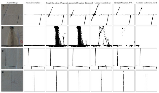 (a–d) are four typical partial examples of expansion joint detection. Columns from left to right are the original images, manually drawn sketches, rough detection results using the proposed method, accurate detection results using the proposed method, detection results using the canny-morphology method, rough detection results using the SWT algorithm and accurate detection results using the SWT algorithm.