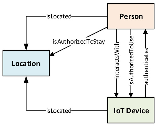 Location also constitutes an important element that needs to be modeled, since the continuous authentication system should consider location-based information in its decision-making processes. Depending on where users are, or the IoT devices’ placement, decision-making processes could grant or deny the corresponding request. Figure 1 depicts certain links between Location and Person and IoT Device in order to trace both users and devices, respectively, within the managed environment. In this sense, Location is modeled as , where n is the number of places such as areas, rooms, etc., where the user can be found and, therefore, authenticated. Given that users and IoT devices expose a tight relationship with their respective locations, to know in which part of the environment they are located, such locations are modeled as and , respectively. For the sake of simplicity, this subsection presents only the model of a reduced number of relationships between components, which is presented in detail in Section 3.2.