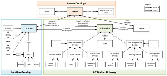 The Location class of the Location Ontology is linked to the top-level class of the other two ontologies through several properties. These properties determine the location in which a Person or an IoT Device is located, by making use of the isLocated property. In addition, the isAuthorizedToStay property has also been defined to determine whether a given Person can be in a certain Location. Here, it is important to highlight that this property is one of the consequences of the authorization policies defined in Section 5).