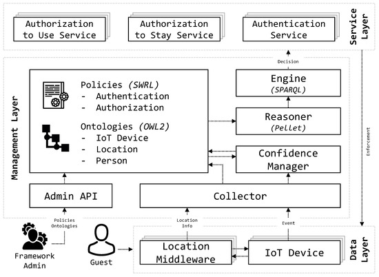 The top-level class in the Person Ontology is Person, exposing two different properties (hasRole and hasAuthLevel with the Role and Authentication Level classes, respectively) aiming to find out whether the Person has sufficient roles and authentication levels (i) to use and interact with a given IoT Device (isAuthorizedToUse property with the IoT Device class) and (ii) to be located in a certain location (isAuthorizedToStay property with the Location class). These last two properties are the consequences of the authorization policies described in Section 5.2, which are created at runtime by the framework administrator.