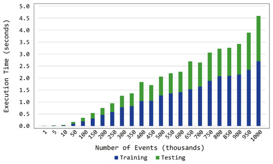 Figure 7 shows the relation between the execution time and the number of events. As expected, the system requires more time to train the model than to perform the testing process. In fact, during the training phase, the probabilistic model is created, while, during the testing phase, the events are directly compared against such model. Another interesting feature is the increasing trend shown by the execution time: that is, when increasing the number of events, the time required by the system linearly increases, reaching ~4 s to deal with 1 million events. Such result allows one to argue that the required execution time scales accordingly with the number of incoming events, thus demonstrating the scalability of the presented component. In addition, the time required to train the model with 100,000 events, and to test 100,000 events against such generated model, is less than 0.5 s, which seems more than acceptable in the context of the proposed scenarios (i.e., smart home or smart office).