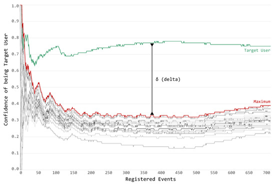 Figure 8 presents the evolution of the confidence for an example guest (i.e., user P23) with respect to the number of sensor events over a long time period (multiple activity tracks). On horizontal axis, multiple activity tracks are combined, highlighting the number of sensor events. On the vertical axis, the confidence score (calculated as defined by Algorithm 2) for the Target User (colored in green), and all the other users (colored with different shades of gray) is presented. Moreover, to help identify the previously defined δ (delta) score (Algorithm 3), both the maximum and the itself have been plotted.