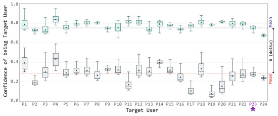 As shown in the boxplot chart in Figure 9, by using the confidence delta (as specified in Algorithm 3), it is possible to clearly recognize the targeted user even when the confidence scores of the other profiles are quite high (e.g., user P4). To be more precise, the confidence score of each targeted uses varies between 0.63 (minimum of user P24) and 0.98 (maximum of user P4), with an average value of 0.78. On the contrary, the other users’ profiles achieves results as low as 0.08 (minimum of user P19) and as high as 0.59 (maximum of user P4), with an average of 0.29.