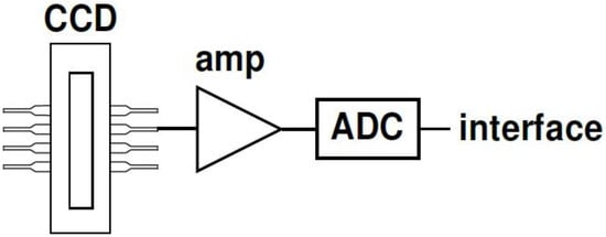 In this study, a Hamamatsu S10420-1106-01 CCD line was connected via an amplifier to a 16-bit analog-to-digital converter (ADC). The ADC was connected to a microcontroller that controlled the measurement parameters (e.g., integration time) and transmitted data to the interface via USB and/or RS232. Figure 2 shows a simple schema, which is nevertheless a good approximation of most of the possible circuit variations.