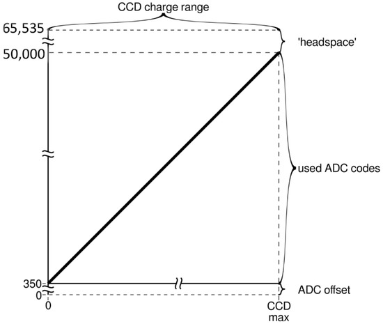 Diagram showing how all possible CCD output values (after amplification; X-axis) are mapped onto the value range of the analog-to-digital converter (ADC; Y-axis). As the zero value of the CCD (and the amplifier) may vary with time, temperature, and/or other factors, this zero value is mapped to a value that lies well inside the value range of the ADC.