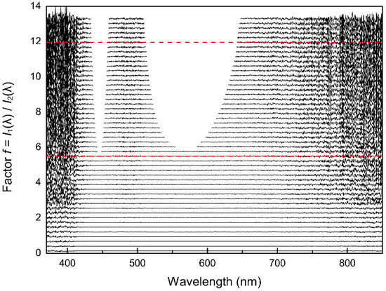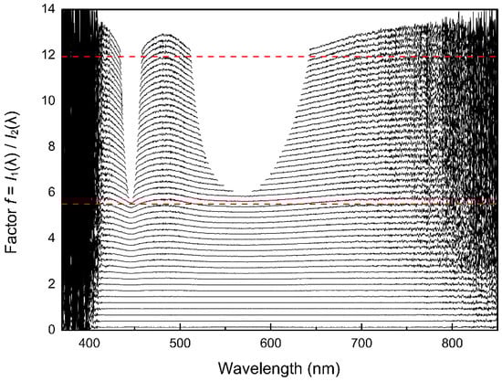 Illustration of the linear dependence of the corrected intensities on the integration time. The ratios f of I1(λ) to Ii(λ) are plotted versus the wavelengths (nm) for several integration times. The correction is valid for different intensities at different integration times and wavelengths and thus verifies the applicability of the correction function. The dashed red lines are expected characteristics for two arbitrarily chosen integration times, the black lines are the corrected observed characteristics for several integration times (compare also with Figure 6).