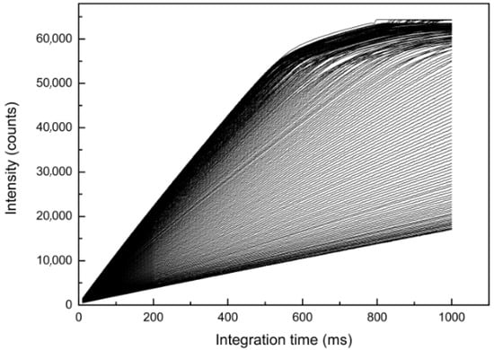Figure 7 shows a selection of pixels for which intensity values were plotted against integration time. As a linear relationship between the intensity and the integration time did not exist for intensity values above 50,000 counts, this threshold was defined as an upper limit of the usable data range. Of the remaining data, the intensities of pixels obtained at the longest integration times were averaged for the intensity range between 47,000 and 50,000 counts in order to construct a referential raw intensity (Iraw) versus integration time (t) curve.