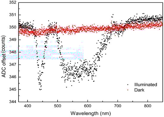ADC offset in counts for all pixels of the CCD line. The black dots were for an enabled light source (illuminated) and the red dots were determined for a disabled light source (dark).