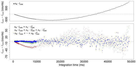 The resulting regression function was used to calculate a corrected intensity (Icorr) for each integration time, independent of wavelength. Icorr represents the expected result (a linear relationship between intensity and integration time) while Iraw represents the measured values a0 to a8, which represent values of regression coefficients; both datasets (one pair of Icorr and Iraw for all integration times) can be used to find a suitable correction function. The models tested for the correction functions were simple polynomial functions up to the ninth degree: