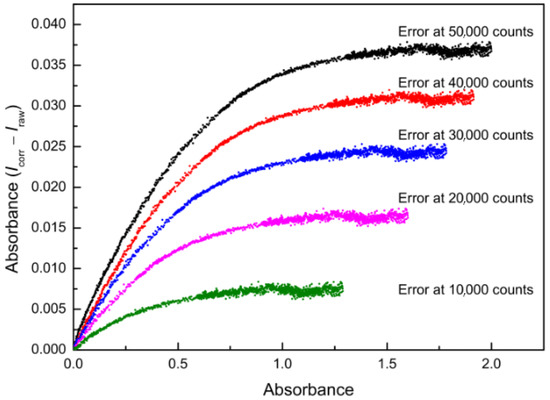 The optimum is a horizontal line, as the ratio I1(λ)/I2(λ) should be constant for all pixels of each spectrum since only the integration time is changed (Figure 6). Differences between corrected (Icorr) and theoretical optimum (Iraw) intensities showed a systematic deviation, for example, the absorbance error at an intensity of 50,000 counts amounts to 0.04 absorbance units (Figure 10). After the correction, the deviation of the corrected intensities from the ideal linear line amounts to a maximum of 40 counts at higher intensities. These 40 counts are well below the noise of the detector (200 counts), and do not show a systematic pattern (Figure 9).