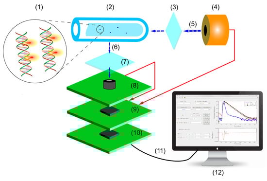 Schematic of the proposed time-correlated single photon-counting (TCSPC) system for DNA analysis. (1) DNA sample bound with fluorophores; (2) liquid-core waveguide (LCW); (3) thin-film neutral density (ND) filter; (4) excitation source; (5) excitation light; (6) emission light; (7) band-pass filter (optional); (8) photon acquisition; (9) time-to-digital conversion; (10) microcontroller unit (MCU); (11) USB connection; (12) data analysis and control.