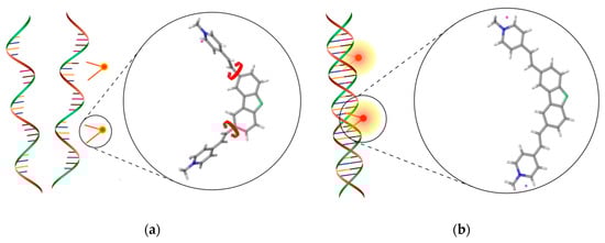 The turn-on phenomenon of the V-carbazole fluorescent molecule. (a) OFF state: V-carbazole molecules are free in the solution. The red arrows indicate that the two arms can rotate freely, resulting in a weak fluorescence signal. (b) ON state: V-carbazole molecules are bound to dsDNA. The two arms are restricted from rotation, resulting in fluorescence signal enhancement.
