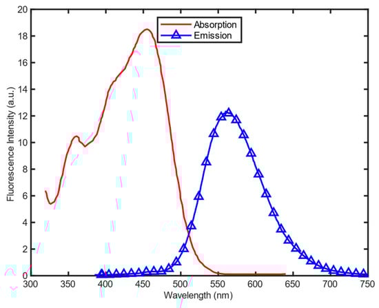 An excitation source, which emits pulsed signal at the absorption wavelength range of the employed fluorescent molecules is required in TCSPC applications. Therefore, to meet the absorption spectrum of V-carbazole depicted in Figure 3, the HORIBA NanoLED N-455 has been selected, with 7 pJ power per pulse, 455 ± 10 nm peak wavelength, and 1.3 ns full width at half maximum (FWHM) pulse width.