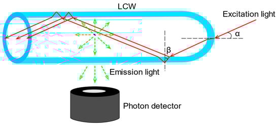 The selection of sample container is of critical importance in TCSPC applications because it influences both the compactness and optical performance of the system. According to the split-mode 3D ray tracing analysis [], a quartz LCW with round/round cross-section geometry (see Figure 5) is selected for the proposed system to achieve both sample containment and excitation rejection. As depicted in Figure 5, excitation light emitting into the LCW with an incident angle α, designed to be smaller than the critical angle, is guided within the LCW. As the excitation light reaches the inner side wall of the LCW, partial reflection occurs because the refractive index of the wall is larger than that of the liquid core. Therefore, at the inner wall, a portion of excitation light enters the wall while the rest is reflected within the liquid core. When the excitation light reaches the outer wall of the LCW, if the angle β is larger than the critical incident angle between the wall and the air, as the refractive index of the wall is higher than that of the surrounding air, TIR occurs. If α is small enough, all the excitation light is confined within the LCW. Simultaneously, as the direction of the emission light is isotropic, a large amount of emission light is able to exit the LCW and reach the detector. Therefore, the LCW performs the dual function of excitation guiding and emission filtering, in a single component, which is a key contributor to overall system size reduction.