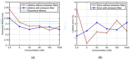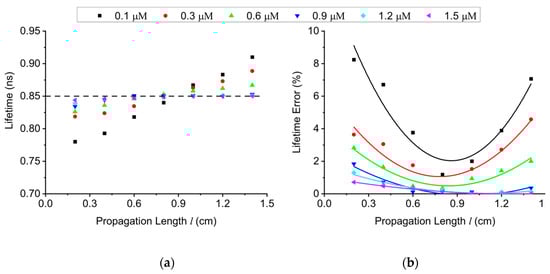 Although LCW offers significant potential for low-cost, portable microsystems, when excitation light travels within the LCW, partial reflections occur thereby decomposing the excitation into multiple split rays. As a result, a fluorescent molecule at one particular location is excited by different split rays, leading to temporal dispersion [] and degradation in lifetime extraction accuracy. The fluorescence lifetime extraction accuracy is influenced by both the temporal dispersion [] and the emission-to-excitation ratio []. The temporal dispersion needs to be smaller than the FWHM of the single photon detector transit time spread (TTS). Therefore, a small propagation length l, i.e., the length of the LCW, is desired []. On the other hand, based on Monte Carlo simulation, a small l reduces the emission-to-excitation ratio, thus degrading lifetime extraction accuracy. Therefore, the selection of l involves the tradeoff between low temporal dispersion and high emission-to-excitation ratio. In fact, the lower and upper boundaries of l are confined by the emission-to-excitation ratio and temporal dispersion, respectively. Given that the wall thickness and inner diameter of the employed LCW are 0.8 mm and 6.4 mm, respectively, the simulated lifetime across V-carbazole concentrations is shown in Figure 6a. Figure 6b depicts the corresponding lifetime error (err) calculated by