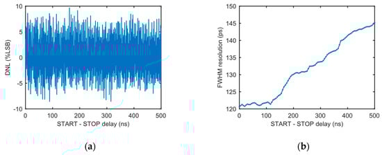 Measured (a) differential nonlinearity (DNL) and (b) full width at half maximum (FWHM) timing resolution of the time-to-digital conversion module in the proposed TCSPC system.
