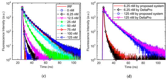 Measured instrument response function (IRF) and decays of the V-carbazole fluorophore with and without dsDNA. (a) IRF and the fluorescence decays of V-carbazole only (i.e., without DNA); (b) IRF and the fluorescence decays of 0.6 μM V-carbazole bound with DNA in various concentrations, measured by the proposed system; (c) IRF and the fluorescence decays of 0.6 μM V-carbazole bound to DNA, measured by DeltaPro (for comparison); (d) fluorescence decays of 0.6 μM V-carbazole bound to 6.25 nM and 125 nM DNA, measured by both systems.