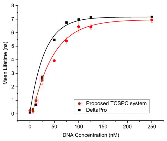 The mean value and standard deviation of the fluorescence lifetime across DNA concentrations extracted using the proposed TCSPC system are depicted in Figure 10, and as a reference compared against the mean fluorescence lifetime extracted by the DeltaPro. The detection limit and dynamic range of the proposed TCSPC system are 6.25 nM and 6.8 ns, respectively. When the DNA concentration is larger than 50 nM, the mean fluorescence lifetime extracted using the proposed TCSPC system is slightly smaller than that of the DelraPro. This is because the detectors employed by DeltaPro and the proposed TCSPC system are PMT and SPAD, respectively. The active area of the SPAD is smaller than that of the PMT, thus a longer measurement time is needed to acquire enough data for lifetime extraction. However, prolonged excitation of fluorescent molecules leads to photobleaching, a photochemical alteration that the fluorescent molecules lose their capacity to fluoresce, resulting in the degradation in lifetime extraction accuracy. This is a limitation of using an SPAD. However, as SPAD technologies continue to improve rapidly, this performance gap is likely to close in the near future. Despite the above, the overall results show that the lifetime curves obtained from the proposed system is similar to that of the DeltaPro.