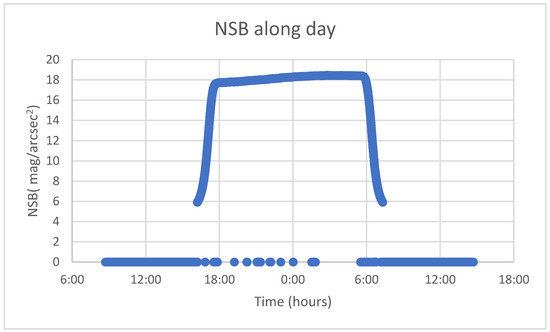 Research related to the use of artificial light during night periods and its consequences has become far more common in recent years. This trend “can be attributed to several factors, including: recognition of the impacts of artificial light on ecology and health, increasing amounts of artificial light in the environment, improved quality of imagery from space, the current global change in lighting technology, and increasing quality, ease, instruments, and methods for measuring light at starlight intensities” [31]. The most common indicator of the night darkness condition is given by the NSB, which refers to the narrow-band spectral radiation of the night sky generally measured in the astronomical magnitude system, instead of SI standard units, mag/arcsec2 (magnitude per square arc-second) [21]. This is a logarithmic scale in which values increase with darker skies.