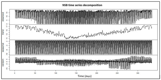 After these considerations, the result was an NSB univariate time series for the whole year (excluding May), which could be decomposed into three single time series. Decomposition aims to segregate the original time series into distinct components with different characteristics in order to analyse each one individually, therefore, it is a helpful analytical tool which allows finding some relationships that are not obvious in the original time series (Figure 3). An additive decomposition can be represented as the sum of three independent time series: