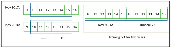 Before applying any method, data were preprocessed using the sliding window technique; this means that the training phase was carried out with data within a specific number of days prior to those intended for the forecast. Therefore, data was segmented according to a specific number of days before a date. This window is moved along the year so that new values can be forecast. Instead of taking a whole dataset, this technique allows using data near the day intended for the forecast, so that the data are more consistent, as long as conditions are similar. As an example, if the intention were to forecast the 16th of November, data from 10th of November (five days before) would be used in the training phase (Figure 4). Full data sets were available for 2016 and 2017 (except for May) and consequently, the sliding window technique can be set with data from a single year that is to be forecast or by adding the same window period for previous years. With the aim of establishing a proper comparison, both options were tested using several sliding windows.