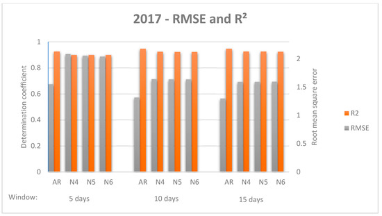 Comparison of forecasting models with different windows for data 2017. Root mean square error and coefficient of determination for each model and window are shown.
