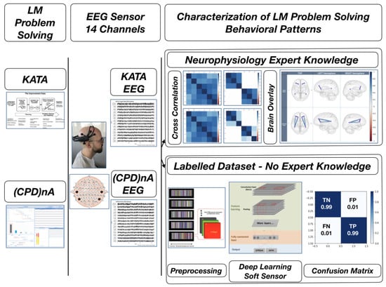 Within this frame, the scope can be narrowed now by seeking to determine which neural processes present a high correlation, while performing two specific LM problem-solving behavioral patterns, KATA [] and (CPD)nA (Check-Plan-Do-...n-times-...-Act) [], as shown in Figure 2: