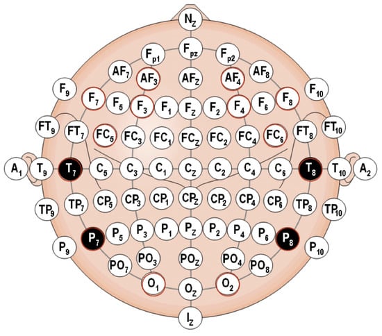 The use of non-invasive brain EEG signals through wearable technology has been previously proven helpful []. Some of the multiple applications of this technology can be found in task recognition [], evaluation of driver vigilance [,,], characterization of focused attention and working memory [], emotional states [] and stress [,] assessment, stimulus recognition [], cognitive workload classification [] or user’s states assessment [], and for the formulation of control commands []. Several electroencephalographic (EEG) standards exist in the sensor characterization on the human brain and in this paper the American Electroencephalography Society [] standard was chosen, as shown in Figure 3.