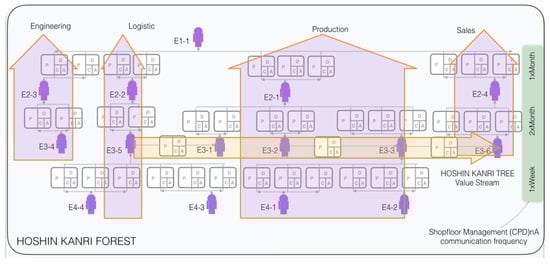 EEG signals that Lean Managers generate within an organization when performing complex process LM optimization tasks are sought to be recorded. The organization selected for this case study is a Japan-based automobile manufacturing facility, embedded within a multinational corporation, where one of the authors has accompanied a systematic implementation of LM methodologies. The factory in which the study is carried out has 30 leaders in four hierarchical levels, and consists of 800 blue collars and 150 white collars. The LM matrix organizational design structure becomes evident when the continuous improvement shopfloor management HOSHIN KANRI FOREST reporting structure [] is visualized in Figure 4: a PDCA-based LM network with a “vertical” hierarchy responsible for the allocation of resources (engineering, logistic, production, sales,...) that is balanced by a “horizontal” structures that connects the process owners along the value stream. In this manner, the organization is aligned to jointly achieve the corporate strategic objectives through continuous improvement. This ensures the systematic weekly training of organizational leaders in LM continuous improvement problem-solving routines.