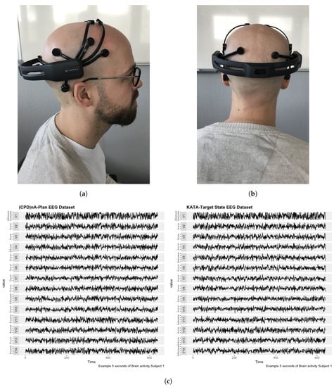 Data Collection. (a) EEG Low-Cost Portable Sensor. (b) EEG Low-Cost Portable Sensor. (c) 5 s recording time series multi-plot of first subject performing (CPD)nA-Plan (a) and KATA-III (b) of Subject 1.