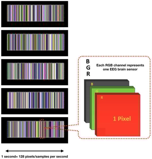 - Multichannel MethodAs described in [], the multichannel data pre-processing method for DL treats data from three EEG channels as three superimposed color levels corresponding to red, green, and blue elements in the RGB color format. The EEG signal strength is projected to a corresponding color value in the [0.1] range. The three values of each point are represented as one pixel in the image. The resolution of the image is the same as the length of the segment (1 s/128 pixels because the sampling rate is 128 samples per second). The data collected from the different sensors are grouped in rows. The advantage of this method is that it greatly reduces the size of the image and results in a much shorter training time than that of the raw EEG time series analysis, and does not require expert knowledge. Figure 6 shows the principle of the application of this method and an example image. The data fragment used in this figure shows the first five seconds of the one used in Figure 5c.