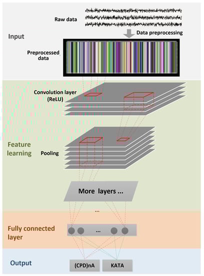 Figure 6. Multichannel Method []. - Deep-Learning Soft Sensor ArchitectureAfter pre-processing and segmentation, the original data segments are transformed into images, to which the DL methods are applied. In this study, the deep convolutional neural network algorithm is used []. This model has its own parameters, such as the number of convolutional layers, the learning rate, pooling size, etc. Figure 7 shows the DL soft sensor architecture and workflow. The first layer to extract features from an input image is the convolution layer. It preserves the relationship between pixels by learning image features using small squares of input data. The Rectified Linear Unit (ReLU) method is used for the non-linear operation to introduce non-linearity in the DL model. Following the convolution layer is the pooling layer which can reduce the dimensionality size. The max pooling method is used in our model, which takes the largest element from the rectified feature map. Multiple convolution layers and pooling layer can be added to the DL model to obtain the best performance. Finally, the feature map matrix produced by the convolution and pooling layers is flattened and fed into the fully connected layer to output the classes using the SoftMax activation function. Following the approach in [], in order to classify between the LM behavioral patterns, the shallow features are merged with the deep-learned features on the last fully connected layer, as shown in Figure 7. More details of the DL models are available online at Open Access Repository.